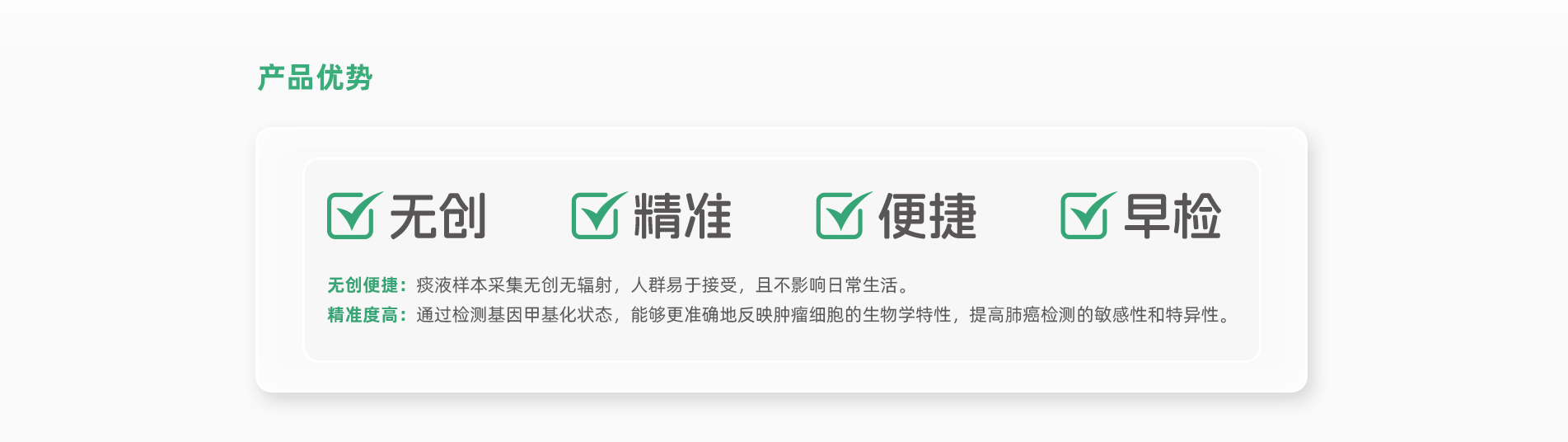 會安心?人類HOXB4、SRCIN1基因甲基化檢測試劑盒(熒光PCR法)于2025年5月29日正式獲批上市,這是首個痰液肺癌甲基化檢測試劑盒。 會安心?通過解讀痰液中脫落腫瘤細胞的基因異常改變(人類HOXB4、SRCIN1基因甲基化)進行肺癌的早期檢測,幫助發(fā)現(xiàn)患者早期肺癌病變情 況, 有希望將肺癌阻斷在早期階段,從而達到提前預防和治療肺癌的目的。