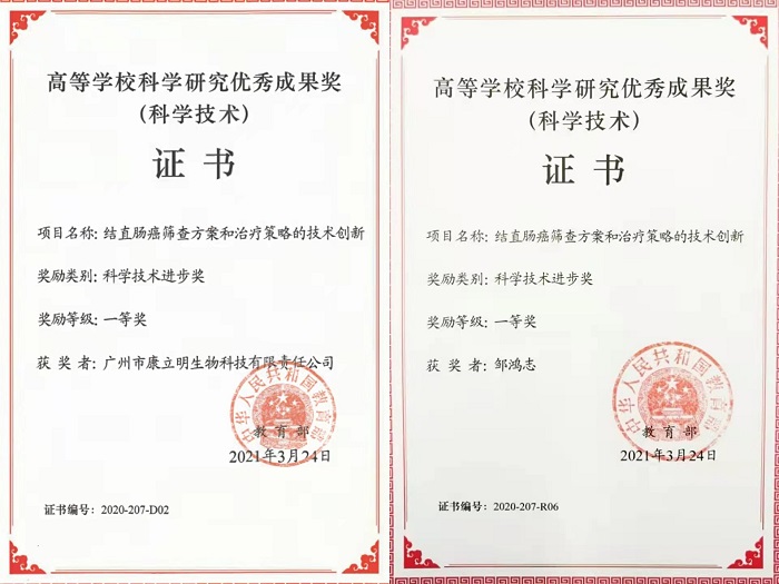 3月24 日,康立明生物及創(chuàng)始人鄒鴻志博士申報的《結(jié)直腸癌篩查方案和治療策略的技術(shù)創(chuàng)新》項目榮獲教育部科學(xué)技術(shù)進步獎一等獎。