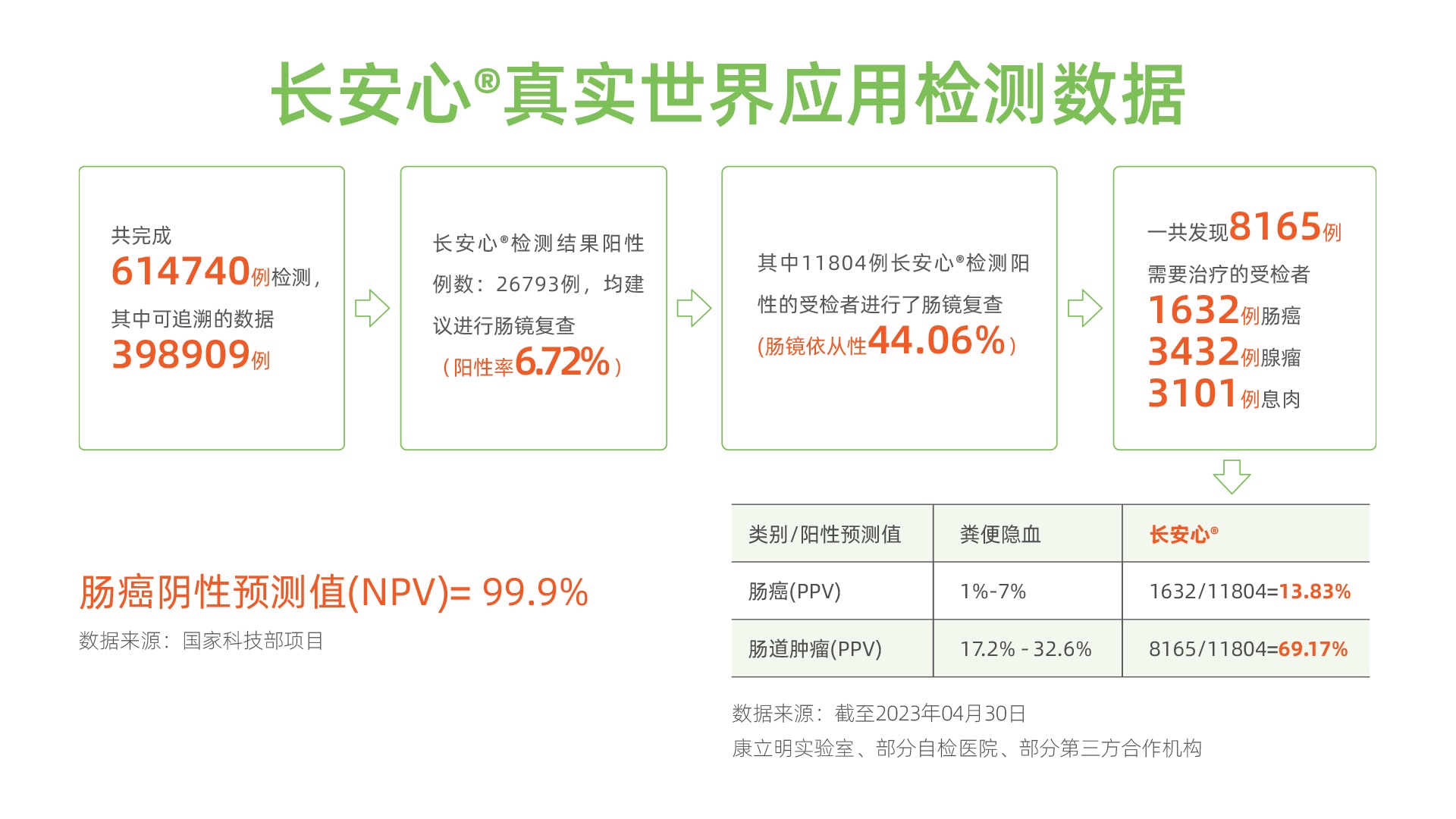 在“人類健康,我之使命”崇高理想下,發(fā)揚(yáng)康立明生物的社會責(zé)任與擔(dān)當(dāng)精神,以長安心®等腫瘤早篩產(chǎn)品的優(yōu)越性能,引領(lǐng)行業(yè)的技術(shù)標(biāo)準(zhǔn),創(chuàng)新的公共衛(wèi)生篩查模式,加大人群的參與度來實(shí)現(xiàn)腫瘤的早診早治。來自康立明醫(yī)學(xué)檢驗實(shí)驗室、部分自檢醫(yī)院、部分第三方合作機(jī)構(gòu)的數(shù)據(jù)顯示:截至2023年4月30日,長安心®共完成614740例檢測,其中可追溯數(shù)據(jù)398909例。長安心®檢測結(jié)果陽性數(shù)26793例(陽性率6.72%),均建議進(jìn)行腸鏡復(fù)查,其中11804例長安心®檢測陽性受檢者進(jìn)行了腸鏡復(fù)查(腸鏡依從性44.06%)。