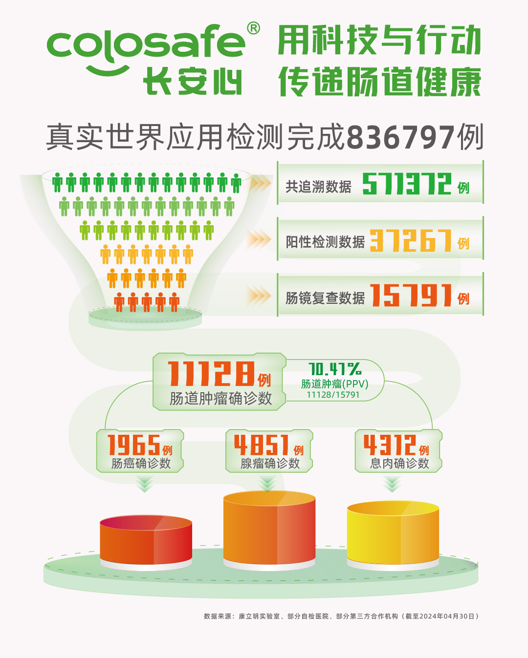 截至2024年4月30日,長安心®共完成836797例檢測,其中可追溯數(shù)據(jù)571372例。檢測結(jié)果陽性37267例(陽性率6.52%),均建議進行腸鏡復(fù)查。其中,15791例檢測陽性受檢者進行了腸鏡復(fù)查(腸鏡依從性42.37%),共發(fā)現(xiàn)11128例需要治療的受檢者,其中腸癌1965例、腺瘤4851例、息肉4312例。長安心®腸癌陽性預(yù)測值(PPV)12.44%,腸道腫瘤陽性預(yù)測值(PPV)70.47%,檢測性能優(yōu)異。