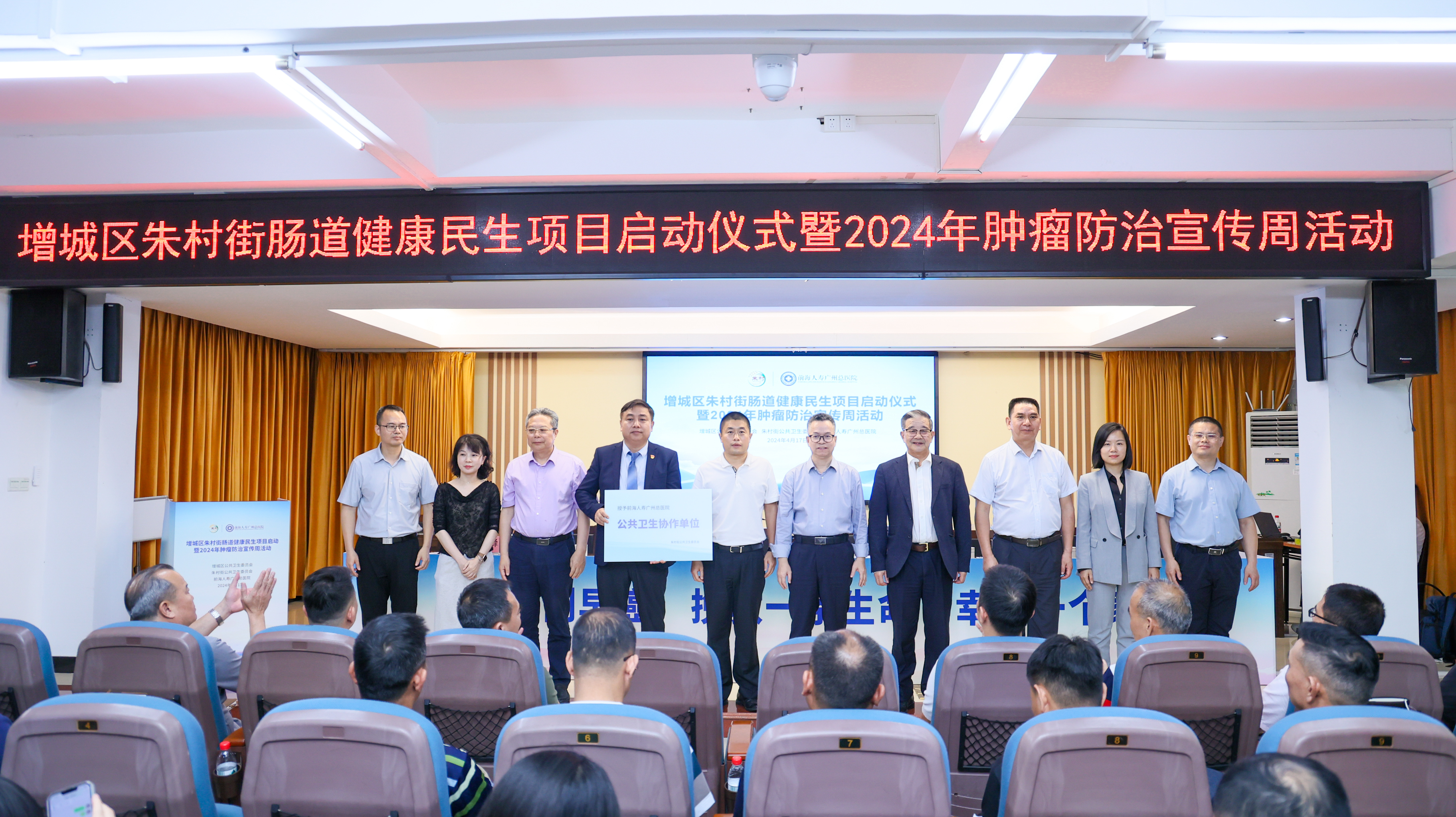 增城區(qū)朱村街黨工委書(shū)記潘國(guó)代表朱村街向前海人壽廣州總醫(yī)院授予“公共衛(wèi)生協(xié)作單位”牌匾。這標(biāo)志著增城區(qū)朱村街“腸道健康民生項(xiàng)目”正式啟動(dòng)。