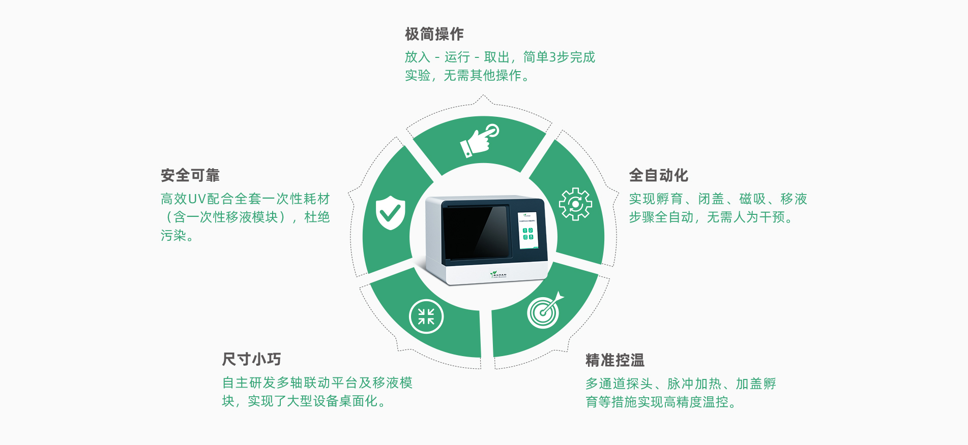 全自動核酸提取儀H24采用了自主研發(fā)的移液模塊、孵育模塊,通過磁珠法全自動實現(xiàn)大體積復雜樣本基因組DNA的提取、富集、轉化、純化過程,解決了復雜樣本高質量核酸自動化提取轉化難題。設備采用多軸聯(lián)動的自動化平臺,配合獨創(chuàng)的移液模塊,極大地縮小了移液平臺尺寸,同時提高了設備運轉效率。